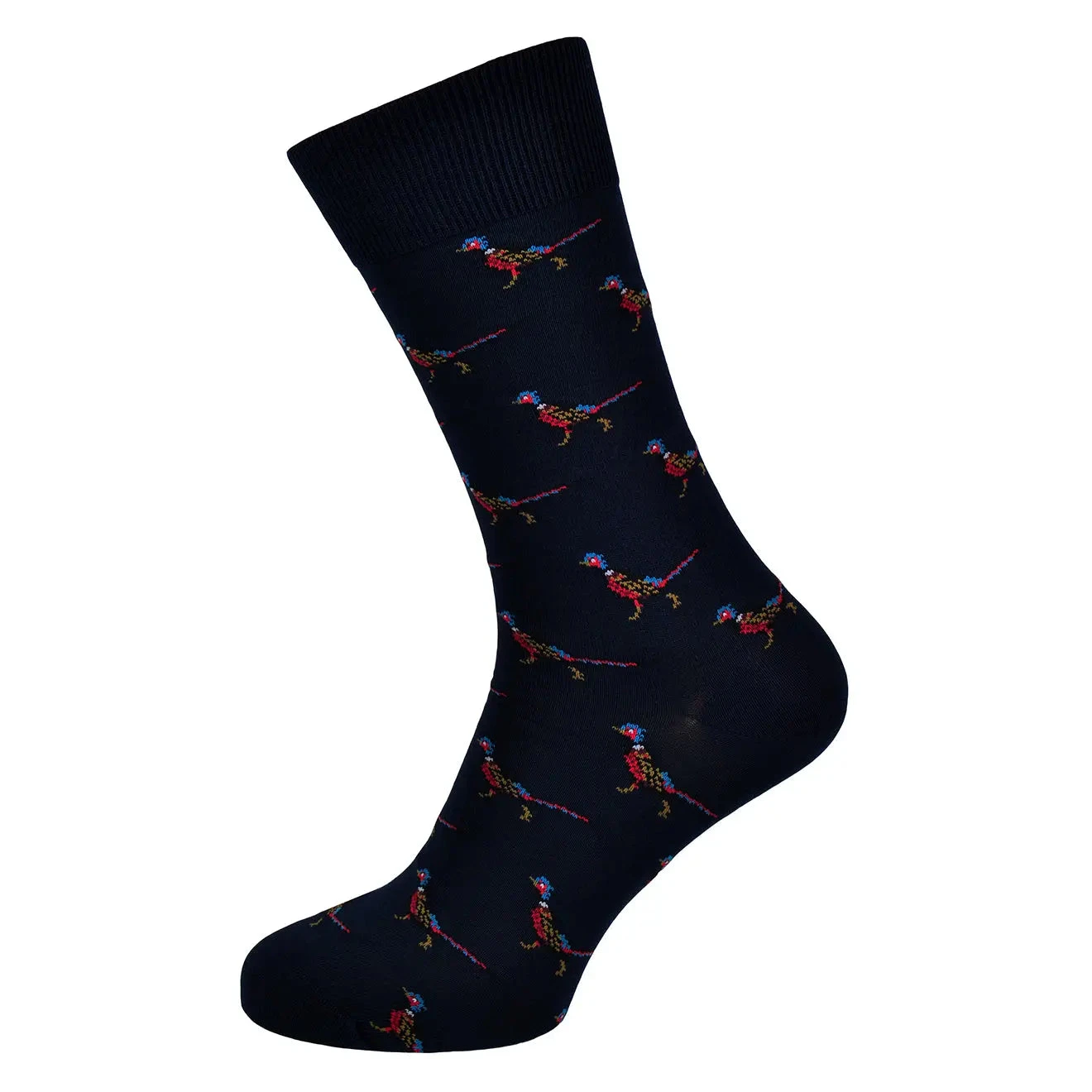 mavin pheasant sock is a unique intarsia knitted sock featuring a country motif and elasticated ribbed cuff.